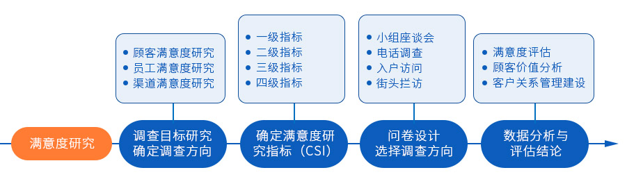 客戶滿意度研究(Consumer Satisfaction Research,簡稱CSR)是指通過對影響被測量對象滿意度的因素進(jìn)行分析,獲得客戶對產(chǎn)品銷售、使用、售后等各個(gè)環(huán)節(jié)的滿意度指標(biāo)評價(jià),發(fā)現(xiàn)影響滿意度的因素、滿意度及消費(fèi)行為三者的關(guān)系,通過優(yōu)化成本,有效的提升影響滿意度的關(guān)鍵因素,改變消費(fèi)者行為,建立和提升忠誠度,達(dá)到減少抱怨和流失,增加重復(fù)性購買行為,創(chuàng)造良好口碑,提升企業(yè)的競爭能力與盈利能力的一種研究方法。