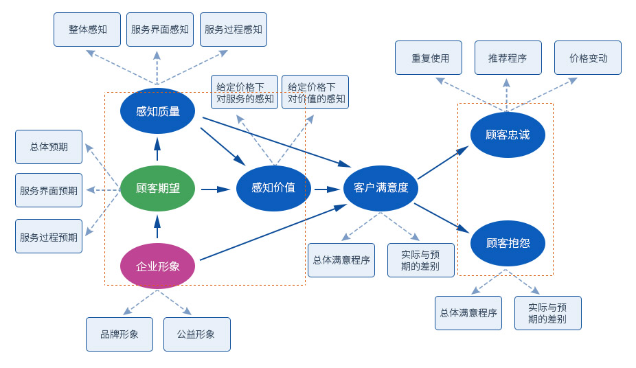 滿意度研究指標(biāo)的四個(gè)層次如下圖表示。